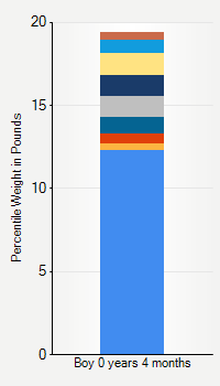 This chart shows weight percentiles, according to the CDC, for boys 4 months of age. To determine an individual's percentile, find the range that includes their weight. This percentile is not a reflection of optimal weight for an individual, it is only for comparing against a population sample. Use the navigation links above the summary chart to view the weight chart for a different age, or to switch between boys and girls or pounds and kilograms.