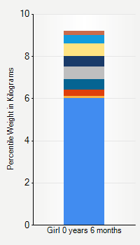 This chart shows weight percentiles, according to the CDC, for girls 6 months of age. To determine an individual's percentile, find the range that includes their weight. This percentile is not a reflection of optimal weight for an individual, it is only for comparing against a population sample. Use the navigation links above the summary chart to view the weight chart for a different age, or to switch between boys and girls or pounds and kilograms.