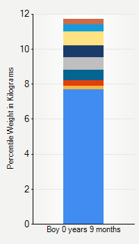 This chart shows weight percentiles, according to the CDC, for boys 9 months of age. To determine an individual's percentile, find the range that includes their weight. This percentile is not a reflection of optimal weight for an individual, it is only for comparing against a population sample. Use the navigation links above the summary chart to view the weight chart for a different age, or to switch between boys and girls or pounds and kilograms.