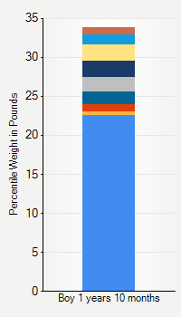 This chart shows weight percentiles, according to the CDC, for boys 1 year 10 months of age. To determine an individual's percentile, find the range that includes their weight. This percentile is not a reflection of optimal weight for an individual, it is only for comparing against a population sample. Use the navigation links above the summary chart to view the weight chart for a different age, or to switch between boys and girls or pounds and kilograms.