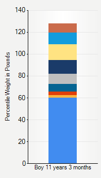 This chart shows weight percentiles, according to the CDC, for boys 11 years 3 months of age. To determine an individual's percentile, find the range that includes their weight. This percentile is not a reflection of optimal weight for an individual, it is only for comparing against a population sample. Use the navigation links above the summary chart to view the weight chart for a different age, or to switch between boys and girls or pounds and kilograms.