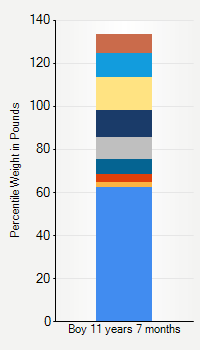 This chart shows weight percentiles, according to the CDC, for boys 11 years 7 months of age. To determine an individual's percentile, find the range that includes their weight. This percentile is not a reflection of optimal weight for an individual, it is only for comparing against a population sample. Use the navigation links above the summary chart to view the weight chart for a different age, or to switch between boys and girls or pounds and kilograms.