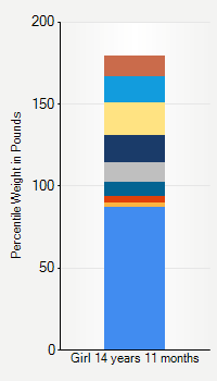This chart shows weight percentiles, according to the CDC, for girls 14 years 11 months of age. To determine an individual's percentile, find the range that includes their weight. This percentile is not a reflection of optimal weight for an individual, it is only for comparing against a population sample. Use the navigation links above the summary chart to view the weight chart for a different age, or to switch between boys and girls or pounds and kilograms.