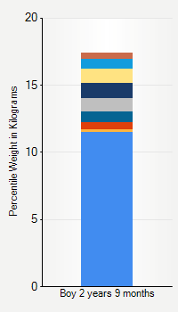 This chart shows weight percentiles, according to the CDC, for boys 2 years 9 months of age. To determine an individual's percentile, find the range that includes their weight. This percentile is not a reflection of optimal weight for an individual, it is only for comparing against a population sample. Use the navigation links above the summary chart to view the weight chart for a different age, or to switch between boys and girls or pounds and kilograms.
