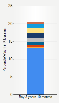 This chart shows weight percentiles, according to the CDC, for boys 3 years 10 months of age. To determine an individual's percentile, find the range that includes their weight. This percentile is not a reflection of optimal weight for an individual, it is only for comparing against a population sample. Use the navigation links above the summary chart to view the weight chart for a different age, or to switch between boys and girls or pounds and kilograms.