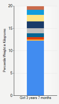 This chart shows weight percentiles, according to the CDC, for girls 3 years 7 months of age. To determine an individual's percentile, find the range that includes their weight. This percentile is not a reflection of optimal weight for an individual, it is only for comparing against a population sample. Use the navigation links above the summary chart to view the weight chart for a different age, or to switch between boys and girls or pounds and kilograms.
