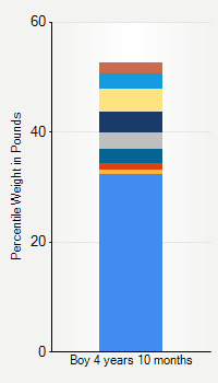 This chart shows weight percentiles, according to the CDC, for boys 4 years 10 months of age. To determine an individual's percentile, find the range that includes their weight. This percentile is not a reflection of optimal weight for an individual, it is only for comparing against a population sample. Use the navigation links above the summary chart to view the weight chart for a different age, or to switch between boys and girls or pounds and kilograms.