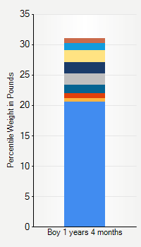 This chart shows weight percentiles, according to the CDC, for girls 4 years 2 months of age. To determine an individual's percentile, find the range that includes their weight. This percentile is not a reflection of optimal weight for an individual, it is only for comparing against a population sample. Use the navigation links above the summary chart to view the weight chart for a different age, or to switch between boys and girls or pounds and kilograms.