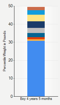 This chart shows weight percentiles, according to the CDC, for boys 4 years 5 months of age. To determine an individual's percentile, find the range that includes their weight. This percentile is not a reflection of optimal weight for an individual, it is only for comparing against a population sample. Use the navigation links above the summary chart to view the weight chart for a different age, or to switch between boys and girls or pounds and kilograms.