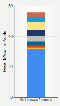 This chart shows weight percentiles, according to the CDC, for girls 5 years 1 month of age. To determine an individual's percentile, find the range that includes their weight. This percentile is not a reflection of optimal weight for an individual, it is only for comparing against a population sample. Use the navigation links above the summary chart to view the weight chart for a different age, or to switch between boys and girls or pounds and kilograms.
