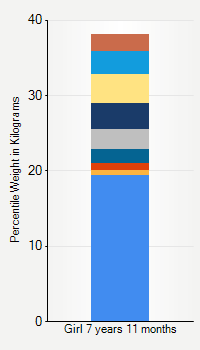 This chart shows weight percentiles, according to the CDC, for girls 7 years 11 months of age. To determine an individual's percentile, find the range that includes their weight. This percentile is not a reflection of optimal weight for an individual, it is only for comparing against a population sample. Use the navigation links above the summary chart to view the weight chart for a different age, or to switch between boys and girls or pounds and kilograms.