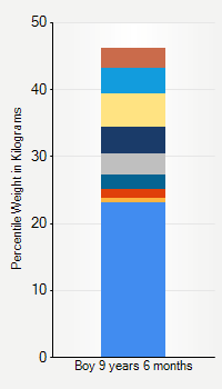 This chart shows weight percentiles, according to the CDC, for boys 9 years 6 months of age. To determine an individual's percentile, find the range that includes their weight. This percentile is not a reflection of optimal weight for an individual, it is only for comparing against a population sample. Use the navigation links above the summary chart to view the weight chart for a different age, or to switch between boys and girls or pounds and kilograms.