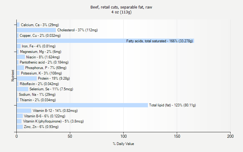 Alanine 0.141 gAlcohol, ethyl 0.0 gArginine 0.151 gAsh 0.08 gAspartic acid 0.212 gCaffeine 0 mgCalcium, Ca 7 mgCarbohydrate, by difference 0.00 gCarotene, alpha 0 mcgCarotene, beta 0 mcgCholesterol 28 mgCopper, Cu 0.008 mgCryptoxanthin, beta 0 mcgCystine 0.030 gEnergy 799 kjEnergy 191 kcalFatty acids, total monounsaturated 8.771 gFatty acids, total polyunsaturated 0.726 gFatty acids, total saturated 8.349 gFiber, total dietary 0.0 gFolate, DFE 0 mcg_DFEFolate, food 0 mcgFolate, total 0 mcgFolic acid 0 mcgGlutamic acid 0.350 gGlycine 0.142 gHistidine 0.074 gHydroxyproline 0.024 gIron, Fe 0.20 mgIsoleucine 0.106 gLeucine 0.185 gLutein + zeaxanthin 0 mcgLycopene 0 mcgLysine 0.197 gMagnesium, Mg 1 mgManganese, Mn 0.000 mgMethionine 0.061 gNiacin 0.407 mgPantothenic acid 0.046 mgPhenylalanine 0.092 gPhosphorus, P 17 mgPotassium, K 27 mgProline 0.111 gProtein 2.33 gRetinol 0 mcgRiboflavin 0.010 mgSelenium, Se 1.9 mcgSerine 0.092 gSodium, Na 7 mgSugars, total 0.00 gTheobromine 0 mgThiamin 0.009 mgThreonine 0.093 gTocopherol, beta 0.00 mgTocopherol, delta 0.00 mgTocopherol, gamma 0.00 mgTotal lipid (fat) 20.10 gTryptophan 0.015 gTyrosine 0.074 gValine 0.115 gVitamin A, IU 0 IUVitamin A, RAE 0 mcg_RAEVitamin B-12 0.21 mcgVitamin B-12, added 0.00 mcgVitamin B-6 0.031 mgVitamin C, total ascorbic acid 0.0 mgVitamin E (alpha-tocopherol) 0.00 mgVitamin E, added 0.00 mgVitamin K (phylloquinone) 1.0 mcgWater 5.73 gZinc, Zn 0.23 mg10:0 0.088 g12:0 0.060 g14:0 0.678 g16:0 5.026 g16:1 undifferentiated 1.100 g18:0 2.498 g18:1 undifferentiated 7.640 g18:2 undifferentiated 0.422 g18:3 undifferentiated 0.303 g18:4 0.000 g20:1 0.031 g20:4 undifferentiated 0.000 g20:5 n-3 0.000 g22:1 undifferentiated 0.000 g22:5 n-3 0.000 g22:6 n-3 0.000 g4:0 0.000 g6:0 0.000 g8:0 0.000 g