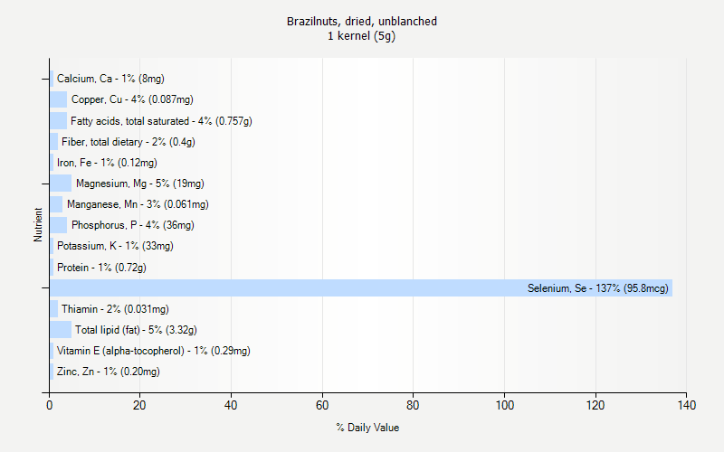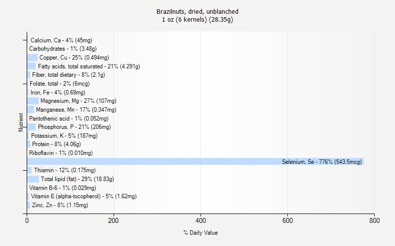 Alanine 0.767 gAlcohol, ethyl 0.0 gArginine 2.857 gAsh 4.67 gAspartic acid 1.790 gBetaine 0.5 mgCaffeine 0 mgCalcium, Ca 213 mgCarbohydrate, by difference 16.32 gCarotene, alpha 0 mcgCarotene, beta 0 mcgCholesterol 0 mgCholine, total 38.3 mgCopper, Cu 2.318 mgCryptoxanthin, beta 0 mcgCystine 0.488 gEnergy 3648 kjEnergy 872 kcalFatty acids, total monounsaturated 32.649 gFatty acids, total polyunsaturated 27.367 gFatty acids, total saturated 20.132 gFiber, total dietary 10.0 gFolate, DFE 29 mcg_DFEFolate, food 29 mcgFolate, total 29 mcgFolic acid 0 mcgFructose 0.00 gGalactose 0.00 gGlucose (dextrose) 0.00 gGlutamic acid 4.186 gGlycine 0.955 gHistidine 0.513 gIron, Fe 3.23 mgIsoleucine 0.686 gLactose 0.00 gLeucine 1.536 gLutein + zeaxanthin 0 mcgLycopene 0 mcgLysine 0.654 gMagnesium, Mg 500 mgMaltose 0.00 gManganese, Mn 1.627 mgMethionine 1.341 gNiacin 0.392 mgPantothenic acid 0.245 mgPhenylalanine 0.838 gPhosphorus, P 964 mgPotassium, K 876 mgProline 0.874 gProtein 19.05 gRetinol 0 mcgRiboflavin 0.047 mgSelenium, Se 2549.6 mcgSerine 0.908 gSodium, Na 4 mgStarch 0.33 gSucrose 3.10 gSugars, total 3.10 gTheobromine 0 mgThiamin 0.821 mgThreonine 0.481 gTocopherol, beta 0.00 mgTocopherol, delta 1.02 mgTocopherol, gamma 10.47 mgTotal lipid (fat) 88.35 gTryptophan 0.188 gTyrosine 0.559 gValine 1.005 gVitamin A, IU 0 IUVitamin A, RAE 0 mcg_RAEVitamin B-12 0.00 mcgVitamin B-12, added 0.00 mcgVitamin B-6 0.134 mgVitamin C, total ascorbic acid 0.9 mgVitamin E (alpha-tocopherol) 7.62 mgVitamin E, added 0.00 mgVitamin K (phylloquinone) 0.0 mcgWater 4.63 gZinc, Zn 5.40 mg10:0 0.000 g12:0 0.000 g14:0 0.069 g14:1 0.000 g15:0 0.000 g15:1 0.000 g16:0 12.083 g16:1 undifferentiated 0.305 g17:0 0.063 g17:1 0.059 g18:0 7.706 g18:1 undifferentiated 32.217 g18:2 undifferentiated 27.322 g18:3 n-3 c,c,c 0.023 g18:3 n-6 c,c,c 0.023 g18:3 undifferentiated 0.047 g18:4 0.000 g20:0 0.213 g20:1 0.069 g20:2 n-6 c,c 0.000 g20:3 undifferentiated 0.000 g20:4 undifferentiated 0.000 g20:5 n-3 0.000 g22:0 0.000 g22:1 undifferentiated 0.000 g22:5 n-3 0.000 g22:6 n-3 0.000 g4:0 0.000 g6:0 0.000 g8:0 0.000 g
