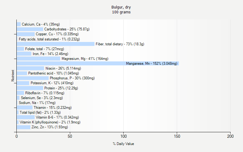 Alanine 0.610 gAlcohol, ethyl 0.0 gArginine 0.805 gAsh 2.11 gAspartic acid 0.882 gCaffeine 0 mgCalcium, Ca 49 mgCarbohydrate, by difference 106.22 gCarotene, alpha 0 mcgCarotene, beta 7 mcgCholesterol 0 mgCholine, total 39.3 mgCopper, Cu 0.469 mgCryptoxanthin, beta 0 mcgCystine 0.399 gEnergy 479 kcalEnergy 2003 kjFatty acids, total monounsaturated 0.242 gFatty acids, total polyunsaturated 0.757 gFatty acids, total saturated 0.325 gFiber, total dietary 25.6 gFolate, DFE 38 mcg_DFEFolate, food 38 mcgFolate, total 38 mcgFolic acid 0 mcgGlutamic acid 5.429 gGlycine 0.693 gHistidine 0.399 gIron, Fe 3.44 mgIsoleucine 0.637 gLeucine 1.162 gLutein + zeaxanthin 308 mcgLycopene 0 mcgLysine 0.475 gMagnesium, Mg 230 mgManganese, Mn 4.267 mgMethionine 0.266 gNiacin 7.160 mgPantothenic acid 1.463 mgPhenylalanine 0.812 gPhosphorus, P 420 mgPotassium, K 574 mgProline 1.785 gProtein 17.21 gRetinol 0 mcgRiboflavin 0.161 mgSelenium, Se 3.2 mcgSerine 0.812 gSodium, Na 24 mgSugars, total 0.57 gTheobromine 0 mgThiamin 0.325 mgThreonine 0.496 gTotal lipid (fat) 1.86 gTryptophan 0.266 gTyrosine 0.501 gValine 0.776 gVitamin A, IU 13 IUVitamin A, RAE 0 mcg_RAEVitamin B-12 0.00 mcgVitamin B-12, added 0.00 mcgVitamin B-6 0.479 mgVitamin C, total ascorbic acid 0.0 mgVitamin E (alpha-tocopherol) 0.08 mgVitamin E, added 0.00 mgVitamin K (phylloquinone) 2.7 mcgWater 12.60 gZinc, Zn 2.70 mg10:0 0.000 g12:0 0.000 g14:0 0.001 g16:0 0.284 g16:1 undifferentiated 0.010 g18:0 0.015 g18:1 undifferentiated 0.232 g18:2 undifferentiated 0.725 g18:3 undifferentiated 0.032 g18:4 0.000 g20:1 0.000 g20:4 undifferentiated 0.000 g20:5 n-3 0.000 g22:1 undifferentiated 0.000 g22:5 n-3 0.000 g22:6 n-3 0.000 g4:0 0.000 g6:0 0.000 g8:0 0.018 g