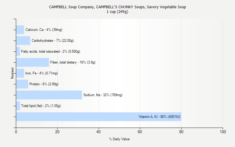 Ash 2.92 gCalcium, Ca 39 mgCarbohydrate, by difference 22.00 gCholesterol 0 mgEnergy 456 kjEnergy 108 kcalFatty acids, total saturated 0.500 gFatty acids, total trans 0.000 gFiber, total dietary 3.9 gIron, Fe 0.71 mgProtein 2.99 gSodium, Na 769 mgSugars, total 6.00 gTotal lipid (fat) 1.00 gVitamin A, IU 4001 IUVitamin C, total ascorbic acid 0.0 mgWater 216.09 g