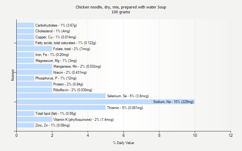 Alcohol, ethyl 0.0 gAsh 1.91 gCaffeine 0 mgCalcium, Ca 5 mgCarbohydrate, by difference 8.99 gCarotene, alpha 2 mcgCarotene, beta 12 mcgCholesterol 10 mgCholine, total 12.0 mgCopper, Cu 0.034 mgCryptoxanthin, beta 0 mcgEnergy 56 kcalEnergy 235 kjFatty acids, total monounsaturated 0.502 gFatty acids, total polyunsaturated 0.380 gFatty acids, total saturated 0.299 gFiber, total dietary 0.2 gFolate, DFE 27 mcg_DFEFolate, food 2 mcgFolate, total 17 mcgFolic acid 15 mcgIron, Fe 0.49 mgLutein + zeaxanthin 20 mcgLycopene 0 mcgMagnesium, Mg 7 mgManganese, Mn 0.078 mgNiacin 1.056 mgPantothenic acid 0.103 mgPhosphorus, P 29 mgPotassium, K 32 mgProtein 2.06 gRetinol 0 mcgRiboflavin 0.074 mgSelenium, Se 9.3 mcgSodium, Na 561 mgSugars, total 0.76 gTheobromine 0 mgThiamin 0.198 mgTotal lipid (fat) 1.35 gVitamin A, IU 27 IUVitamin A, RAE 2 mcg_RAEVitamin B-12 0.05 mcgVitamin B-12, added 0.00 mcgVitamin B-6 0.024 mgVitamin C, total ascorbic acid 0.0 mgVitamin E (alpha-tocopherol) 0.12 mgVitamin E, added 0.00 mgVitamin K (phylloquinone) 3.4 mcgWater 230.69 gZinc, Zn 0.20 mg10:0 0.000 g12:0 0.000 g14:0 0.005 g16:0 0.220 g16:1 undifferentiated 0.039 g18:0 0.069 g18:1 undifferentiated 0.456 g18:2 undifferentiated 0.348 g18:3 undifferentiated 0.020 g18:4 0.000 g20:1 0.005 g20:4 undifferentiated 0.005 g20:5 n-3 0.000 g22:1 undifferentiated 0.000 g22:5 n-3 0.000 g22:6 n-3 0.002 g4:0 0.000 g6:0 0.000 g8:0 0.000 g