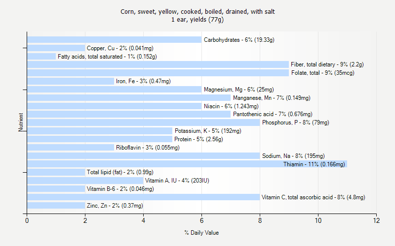 Alanine 0.271 gAlcohol, ethyl 0.0 gArginine 0.120 gAsh 0.64 gAspartic acid 0.224 gCaffeine 0 mgCalcium, Ca 2 mgCarbohydrate, by difference 22.35 gCarotene, alpha 20 mcgCarotene, beta 59 mcgCholesterol 0 mgCholine, total 25.9 mgCopper, Cu 0.047 mgCryptoxanthin, beta 143 mcgCystine 0.024 gEnergy 96 kcalEnergy 402 kjFatty acids, total monounsaturated 0.333 gFatty acids, total polyunsaturated 0.537 gFatty acids, total saturated 0.175 gFiber, total dietary 2.5 gFolate, DFE 41 mcg_DFEFolate, food 41 mcgFolate, total 41 mcgFolic acid 0 mcgFructose 0.38 gGalactose 0.00 gGlucose (dextrose) 0.60 gGlutamic acid 0.583 gGlycine 0.117 gHistidine 0.081 gIron, Fe 0.54 mgIsoleucine 0.118 gLactose 0.00 gLeucine 0.319 gLutein + zeaxanthin 806 mcgLycopene 0 mcgLysine 0.125 gMagnesium, Mg 28 mgMaltose 0.29 gManganese, Mn 0.173 mgMethionine 0.061 gNiacin 1.436 mgPantothenic acid 0.781 mgPhenylalanine 0.138 gPhosphorus, P 92 mgPotassium, K 222 mgProline 0.268 gProtein 2.95 gRetinol 0 mcgRiboflavin 0.064 mgSelenium, Se 0.2 mcgSerine 0.141 gSodium, Na 225 mgSucrose 1.54 gSugars, total 2.82 gTheobromine 0 mgThiamin 0.191 mgThreonine 0.118 gTocopherol, beta 0.00 mgTocopherol, delta 0.00 mgTocopherol, gamma 0.17 mgTotal lipid (fat) 1.14 gTryptophan 0.020 gTyrosine 0.112 gValine 0.170 gVitamin A, IU 234 IUVitamin A, RAE 12 mcg_RAEVitamin B-12 0.00 mcgVitamin B-12, added 0.00 mcgVitamin B-6 0.053 mgVitamin C, total ascorbic acid 5.5 mgVitamin E (alpha-tocopherol) 0.08 mgVitamin E, added 0.00 mgVitamin K (phylloquinone) 0.4 mcgWater 61.92 gZinc, Zn 0.43 mg10:0 0.000 g12:0 0.000 g14:0 0.000 g16:0 0.165 g16:1 undifferentiated 0.000 g18:0 0.011 g18:1 undifferentiated 0.333 g18:2 undifferentiated 0.522 g18:3 undifferentiated 0.016 g18:4 0.000 g20:1 0.000 g20:4 undifferentiated 0.000 g20:5 n-3 0.000 g22:1 undifferentiated 0.000 g22:5 n-3 0.000 g22:6 n-3 0.000 g4:0 0.000 g6:0 0.000 g8:0 0.000 g