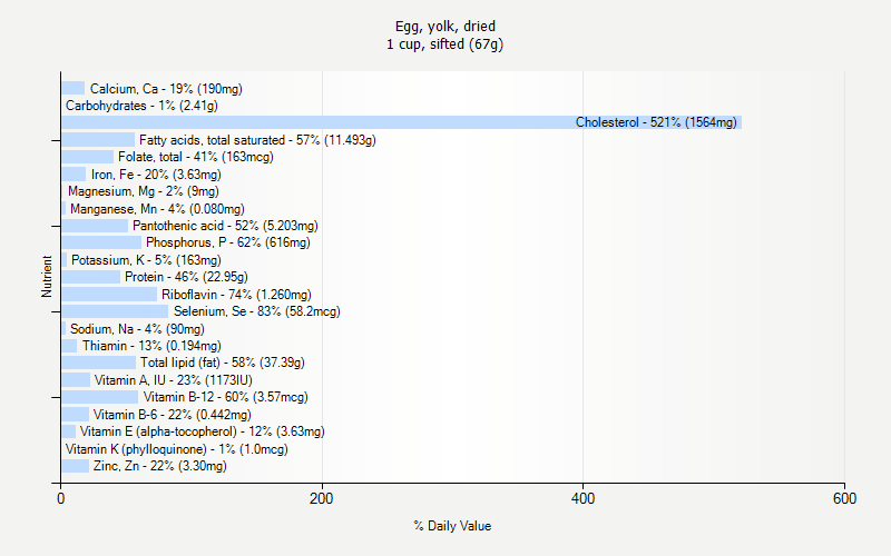 Alanine 1.179 gAlcohol, ethyl 0.0 gArginine 1.637 gAsh 2.28 gAspartic acid 2.243 gCaffeine 0 mgCalcium, Ca 190 mgCarbohydrate, by difference 2.41 gCarotene, alpha 53 mcgCarotene, beta 125 mcgCholesterol 1564 mgCholine, total 930.2 mgCopper, Cu 0.008 mgCryptoxanthin, beta 47 mcgCystine 0.411 gEnergy 1867 kjEnergy 446 kcalFatty acids, total monounsaturated 14.156 gFatty acids, total polyunsaturated 5.290 gFatty acids, total saturated 11.493 gFiber, total dietary 0.0 gFolate, DFE 163 mcg_DFEFolate, food 163 mcgFolate, total 163 mcgFolic acid 0 mcgGlutamic acid 2.908 gGlycine 0.709 gHistidine 0.595 gIron, Fe 3.63 mgIsoleucine 1.160 gLeucine 2.016 gLutein + zeaxanthin 1540 mcgLycopene 0 mcgLysine 1.821 gMagnesium, Mg 9 mgManganese, Mn 0.080 mgMethionine 0.569 gNiacin 0.064 mgPantothenic acid 5.203 mgPhenylalanine 0.980 gPhosphorus, P 616 mgPotassium, K 163 mgProline 0.958 gProtein 22.95 gRetinol 265 mcgRiboflavin 1.260 mgSelenium, Se 58.2 mcgSerine 1.960 gSodium, Na 90 mgSugars, total 2.41 gTheobromine 0 mgThiamin 0.194 mgThreonine 1.219 gTotal lipid (fat) 37.39 gTryptophan 0.268 gTyrosine 1.020 gValine 1.278 gVitamin A, IU 1173 IUVitamin A, RAE 279 mcg_RAEVitamin B-12 3.57 mcgVitamin B-12, added 0.00 mcgVitamin B-6 0.442 mgVitamin C, total ascorbic acid 0.0 mgVitamin E (alpha-tocopherol) 3.63 mgVitamin E, added 0.00 mgVitamin K (phylloquinone) 1.0 mcgWater 1.98 gZinc, Zn 3.30 mg10:0 0.000 g12:0 0.000 g14:0 0.121 g16:0 8.415 g16:1 undifferentiated 0.920 g18:0 2.898 g18:1 undifferentiated 13.089 g18:2 undifferentiated 4.303 g18:3 undifferentiated 0.084 g18:4 0.046 g20:1 0.100 g20:4 undifferentiated 0.561 g20:5 n-3 0.136 g22:1 undifferentiated 0.000 g22:5 n-3 0.000 g22:6 n-3 0.160 g4:0 0.000 g6:0 0.000 g8:0 0.000 g
