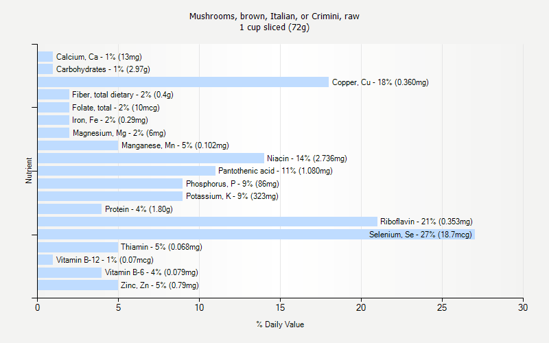 Alanine 0.163 gArginine 0.107 gAsh 0.85 gAspartic acid 0.198 gBetaine 9.7 mgCalcium, Ca 16 mgCarbohydrate, by difference 3.58 gCholesterol 0 mgCholine, total 19.2 mgCopper, Cu 0.435 mgCystine 0.005 gEnergy 23 kcalEnergy 100 kjFatty acids, total monounsaturated 0.002 gFatty acids, total polyunsaturated 0.037 gFatty acids, total saturated 0.012 gFiber, total dietary 0.5 gFolate, DFE 12 mcg_DFEFolate, food 12 mcgFolate, total 12 mcgFolic acid 0 mcgGlutamic acid 0.372 gGlycine 0.097 gHistidine 0.058 gIron, Fe 0.35 mgIsoleucine 0.086 gLeucine 0.133 gLysine 0.219 gMagnesium, Mg 8 mgManganese, Mn 0.124 mgMethionine 0.042 gNiacin 3.306 mgPantothenic acid 1.305 mgPhenylalanine 0.084 gPhosphorus, P 104 mgPotassium, K 390 mgProline 0.153 gProtein 2.18 gRetinol 0 mcgRiboflavin 0.426 mgSelenium, Se 22.6 mcgSerine 0.098 gSodium, Na 5 mgSugars, total 1.50 gThiamin 0.083 mgThreonine 0.098 gTocopherol, beta 0.00 mgTocopherol, delta 0.00 mgTocopherol, gamma 0.00 mgTotal lipid (fat) 0.09 gTryptophan 0.049 gTyrosine 0.047 gValine 0.100 gVitamin A, IU 0 IUVitamin A, RAE 0 mcg_RAEVitamin B-12 0.09 mcgVitamin B-6 0.096 mgVitamin C, total ascorbic acid 0.0 mgVitamin E (alpha-tocopherol) 0.01 mgVitamin K (phylloquinone) 0.0 mcgWater 80.30 gZinc, Zn 0.96 mg10:0 0.000 g12:0 0.001 g14:0 0.001 g16:0 0.006 g16:1 undifferentiated 0.000 g18:0 0.002 g18:1 undifferentiated 0.002 g18:2 undifferentiated 0.035 g18:3 undifferentiated 0.000 g18:4 0.000 g20:1 0.000 g20:4 undifferentiated 0.000 g20:5 n-3 0.000 g22:1 undifferentiated 0.000 g22:5 n-3 0.000 g22:6 n-3 0.000 g4:0 0.000 g6:0 0.000 g8:0 0.000 g
