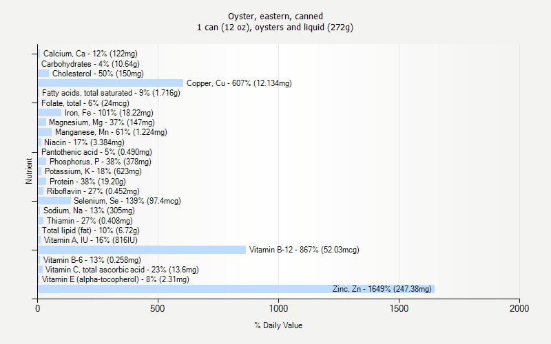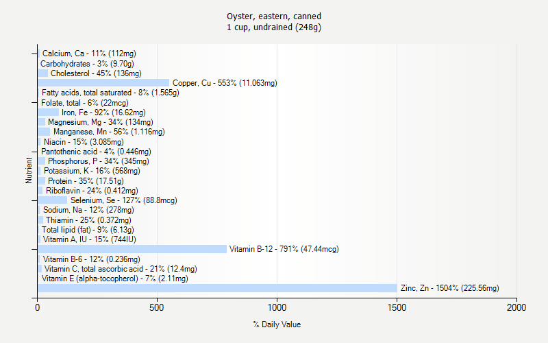 Alanine 0.692 gAlcohol, ethyl 0.0 gArginine 0.834 gAsh 2.30 gAspartic acid 1.103 gCaffeine 0 mgCalcium, Ca 73 mgCarbohydrate, by difference 6.33 gCarotene, alpha 0 mcgCarotene, beta 0 mcgCholesterol 89 mgCholine, total 131.2 mgCopper, Cu 7.227 mgCryptoxanthin, beta 0 mcgCystine 0.151 gEnergy 112 kcalEnergy 468 kjFatty acids, total monounsaturated 0.405 gFatty acids, total polyunsaturated 1.197 gFatty acids, total saturated 1.022 gFiber, total dietary 0.0 gFolate, DFE 15 mcg_DFEFolate, food 15 mcgFolate, total 15 mcgFolic acid 0 mcgGlutamic acid 1.557 gGlycine 0.716 gHistidine 0.220 gIron, Fe 10.85 mgIsoleucine 0.497 gLeucine 0.805 gLutein + zeaxanthin 0 mcgLycopene 0 mcgLysine 0.855 gMagnesium, Mg 87 mgManganese, Mn 0.729 mgMethionine 0.258 gNiacin 2.015 mgPantothenic acid 0.292 mgPhenylalanine 0.410 gPhosphorus, P 225 mgPotassium, K 371 mgProline 0.467 gProtein 11.44 gRetinol 146 mcgRiboflavin 0.269 mgSelenium, Se 58.0 mcgSerine 0.512 gSodium, Na 181 mgSugars, total 0.00 gTheobromine 0 mgThiamin 0.243 mgThreonine 0.492 gTotal lipid (fat) 4.00 gTryptophan 0.128 gTyrosine 0.366 gValine 0.499 gVitamin A, IU 486 IUVitamin A, RAE 146 mcg_RAEVitamin B-12 30.99 mcgVitamin B-12, added 0.00 mcgVitamin B-6 0.154 mgVitamin C, total ascorbic acid 8.1 mgVitamin E (alpha-tocopherol) 1.38 mgVitamin E, added 0.00 mgVitamin K (phylloquinone) 0.2 mcgWater 137.93 gZinc, Zn 147.34 mg10:0 0.000 g12:0 0.000 g14:0 0.177 g16:0 0.705 g16:1 undifferentiated 0.120 g18:0 0.097 g18:1 undifferentiated 0.157 g18:2 undifferentiated 0.079 g18:3 undifferentiated 0.060 g18:4 0.156 g20:1 0.097 g20:4 undifferentiated 0.110 g20:5 n-3 0.342 g22:1 undifferentiated 0.015 g22:5 n-3 0.081 g22:6 n-3 0.369 g4:0 0.000 g6:0 0.000 g8:0 0.000 g