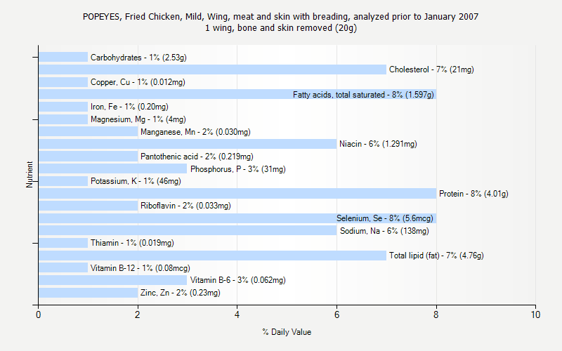 % Daily Value for POPEYES, Fried Chicken, Mild, Wing, meat and skin with breading, analyzed prior to January 2007 1 wing, bone and skin removed (20g)