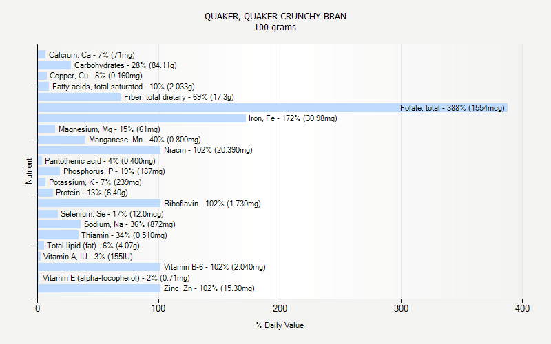 Alcohol, ethyl 0.0 gAsh 0.92 gCaffeine 0 mgCalcium, Ca 19 mgCarbohydrate, by difference 22.71 gCarotene, alpha 12 mcgCarotene, beta 19 mcgCholesterol 0 mgCholine, total 3.9 mgCopper, Cu 0.043 mgCryptoxanthin, beta 0 mcgEnergy 376 kjEnergy 90 kcalFatty acids, total monounsaturated 0.205 gFatty acids, total polyunsaturated 0.325 gFatty acids, total saturated 0.549 gFatty acids, total trans 0.000 gFiber, total dietary 4.7 gFolate, DFE 710 mcg_DFEFolate, food 5 mcgFolate, total 420 mcgFolic acid 414 mcgIron, Fe 8.36 mgLutein + zeaxanthin 255 mcgLycopene 0 mcgMagnesium, Mg 16 mgManganese, Mn 0.216 mgNiacin 5.505 mgPantothenic acid 0.108 mgPhosphorus, P 50 mgPotassium, K 65 mgProtein 1.73 gRetinol 0 mcgRiboflavin 0.467 mgSelenium, Se 3.2 mcgSodium, Na 235 mgSugars, total 5.60 gTheobromine 0 mgThiamin 0.138 mgTotal lipid (fat) 1.10 gVitamin A, IU 42 IUVitamin A, RAE 2 mcg_RAEVitamin B-12 0.00 mcgVitamin B-12, added 0.00 mcgVitamin B-6 0.551 mgVitamin C, total ascorbic acid 0.0 mgVitamin D 0 IUVitamin E (alpha-tocopherol) 0.19 mgVitamin E, added 0.00 mgVitamin K (phylloquinone) 0.1 mcgWater 0.54 gZinc, Zn 4.13 mg10:0 0.035 g12:0 0.258 g14:0 0.097 g16:0 0.089 g16:1 undifferentiated 0.001 g18:0 0.021 g18:1 undifferentiated 0.204 g18:2 undifferentiated 0.315 g18:3 undifferentiated 0.010 g18:4 0.000 g20:1 0.000 g20:4 undifferentiated 0.000 g20:5 n-3 0.000 g22:1 undifferentiated 0.000 g22:5 n-3 0.000 g22:6 n-3 0.000 g4:0 0.000 g6:0 0.004 g8:0 0.043 g