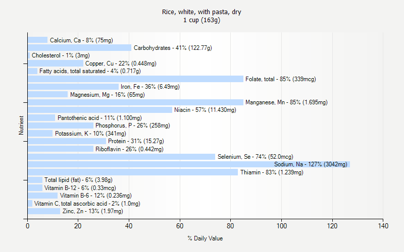 Alanine 0.717 gArginine 0.998 gAsh 9.37 gAspartic acid 1.123 gCalcium, Ca 75 mgCarbohydrate, by difference 122.77 gCholesterol 3 mgCopper, Cu 0.448 mgCystine 0.326 gEnergy 2510 kjEnergy 600 kcalFatty acids, total monounsaturated 1.046 gFatty acids, total polyunsaturated 1.575 gFatty acids, total saturated 0.717 gFolate, DFE 540 mcg_DFEFolate, food 54 mcgFolate, total 339 mcgFolic acid 285 mcgGlutamic acid 3.945 gGlycine 0.613 gHistidine 0.339 gIron, Fe 6.49 mgIsoleucine 0.629 gLeucine 1.177 gLysine 0.448 gMagnesium, Mg 65 mgManganese, Mn 1.695 mgMethionine 0.311 gNiacin 11.430 mgPantothenic acid 1.100 mgPhenylalanine 0.786 gPhosphorus, P 258 mgPotassium, K 341 mgProline 1.086 gProtein 15.27 gRetinol 0 mcgRiboflavin 0.442 mgSelenium, Se 52.0 mcgSerine 0.769 gSodium, Na 3042 mgThiamin 1.239 mgThreonine 0.487 gTotal lipid (fat) 3.98 gTryptophan 0.186 gTyrosine 0.538 gValine 0.822 gVitamin A, IU 0 IUVitamin A, RAE 0 mcg_RAEVitamin B-12 0.33 mcgVitamin B-6 0.236 mgVitamin C, total ascorbic acid 1.0 mgWater 11.62 gZinc, Zn 1.97 mg14:0 0.008 g16:0 0.652 g16:1 undifferentiated 0.003 g18:0 0.046 g18:1 undifferentiated 1.043 g18:2 undifferentiated 1.488 g18:3 undifferentiated 0.086 g