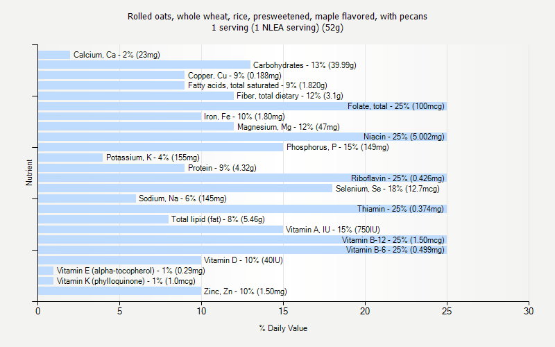 Alcohol, ethyl 0.0 gAsh 0.88 gCaffeine 0 mgCalcium, Ca 23 mgCarbohydrate, by difference 39.99 gCarotene, alpha 0 mcgCarotene, beta 2 mcgCholesterol 0 mgCholine, total 12.3 mgCopper, Cu 0.188 mgCryptoxanthin, beta 1 mcgEnergy 919 kjEnergy 219 kcalFatty acids, total monounsaturated 2.080 gFatty acids, total polyunsaturated 1.144 gFatty acids, total saturated 1.820 gFatty acids, total trans 0.052 gFiber, total dietary 3.1 gFolate, DFE 163 mcg_DFEFolate, food 10 mcgFolate, total 100 mcgFolic acid 90 mcgIron, Fe 1.80 mgLutein + zeaxanthin 42 mcgLycopene 0 mcgMagnesium, Mg 47 mgNiacin 5.002 mgPhosphorus, P 149 mgPotassium, K 155 mgProtein 4.32 gRetinol 224 mcgRiboflavin 0.426 mgSelenium, Se 12.7 mcgSodium, Na 145 mgSugars, total 12.74 gTheobromine 0 mgThiamin 0.374 mgTotal lipid (fat) 5.46 gVitamin A, IU 750 IUVitamin A, RAE 224 mcg_RAEVitamin B-12 1.50 mcgVitamin B-12, added 1.48 mcgVitamin B-6 0.499 mgVitamin C, total ascorbic acid 0.0 mgVitamin D 40 IUVitamin E (alpha-tocopherol) 0.29 mgVitamin E, added 0.00 mgVitamin K (phylloquinone) 1.0 mcgWater 1.35 gZinc, Zn 1.50 mg10:0 0.054 g12:0 0.726 g14:0 0.225 g14:1 0.000 g16:0 0.422 g16:1 undifferentiated 0.003 g18:0 0.307 g18:1 undifferentiated 2.068 g18:2 undifferentiated 1.088 g18:3 undifferentiated 0.056 g18:4 0.000 g20:0 0.006 g20:1 0.009 g20:2 n-6 c,c 0.000 g20:3 undifferentiated 0.000 g20:4 undifferentiated 0.000 g20:5 n-3 0.000 g22:0 0.000 g22:1 undifferentiated 0.000 g22:4 0.000 g22:5 n-3 0.000 g22:6 n-3 0.000 g24:0 0.000 g24:1 c 0.000 g4:0 0.002 g6:0 0.005 g8:0 0.064 g