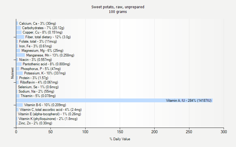 Alanine 0.102 gAlcohol, ethyl 0.0 gArginine 0.073 gAsh 1.32 gAspartic acid 0.508 gCaffeine 0 mgCalcium, Ca 40 mgCarbohydrate, by difference 26.76 gCarotene, alpha 9 mcgCarotene, beta 11317 mcgCholesterol 0 mgCholine, total 16.4 mgCopper, Cu 0.201 mgCryptoxanthin, beta 0 mcgCystine 0.029 gEnergy 114 kcalEnergy 477 kjFatty acids, total monounsaturated 0.001 gFatty acids, total polyunsaturated 0.019 gFatty acids, total saturated 0.024 gFiber, total dietary 4.0 gFolate, DFE 15 mcg_DFEFolate, food 15 mcgFolate, total 15 mcgFolic acid 0 mcgFructose 0.93 gGalactose 0.00 gGlucose (dextrose) 1.28 gGlutamic acid 0.206 gGlycine 0.084 gHistidine 0.041 gIron, Fe 0.81 mgIsoleucine 0.073 gLactose 0.00 gLeucine 0.122 gLutein + zeaxanthin 0 mcgLycopene 0 mcgLysine 0.088 gMagnesium, Mg 33 mgMaltose 0.00 gManganese, Mn 0.343 mgMethionine 0.039 gNiacin 0.741 mgPantothenic acid 1.064 mgPhenylalanine 0.118 gPhosphorus, P 63 mgPhytosterols 16 mgPotassium, K 448 mgProline 0.069 gProtein 2.09 gRetinol 0 mcgRiboflavin 0.081 mgSelenium, Se 0.8 mcgSerine 0.117 gSodium, Na 73 mgStarch 16.82 gSucrose 3.35 gSugars, total 5.56 gTheobromine 0 mgThiamin 0.104 mgThreonine 0.110 gTocopherol, beta 0.01 mgTocopherol, delta 0.00 mgTocopherol, gamma 0.00 mgTotal lipid (fat) 0.07 gTryptophan 0.041 gTyrosine 0.045 gValine 0.114 gVitamin A, IU 18869 IUVitamin A, RAE 943 mcg_RAEVitamin B-12 0.00 mcgVitamin B-12, added 0.00 mcgVitamin B-6 0.278 mgVitamin C, total ascorbic acid 3.2 mgVitamin E (alpha-tocopherol) 0.35 mgVitamin E, added 0.00 mgVitamin K (phylloquinone) 2.4 mcgWater 102.78 gZinc, Zn 0.40 mg10:0 0.000 g12:0 0.000 g14:0 0.000 g14:1 0.000 g15:0 0.000 g15:1 0.000 g16:0 0.024 g16:1 undifferentiated 0.000 g17:0 0.000 g17:1 0.000 g18:0 0.001 g18:1 undifferentiated 0.001 g18:2 undifferentiated 0.017 g18:3 undifferentiated 0.001 g18:4 0.000 g20:0 0.000 g20:1 0.000 g20:2 n-6 c,c 0.000 g20:3 undifferentiated 0.000 g20:4 undifferentiated 0.000 g20:5 n-3 0.000 g22:0 0.000 g22:1 undifferentiated 0.000 g22:5 n-3 0.000 g22:6 n-3 0.000 g24:0 0.000 g4:0 0.000 g6:0 0.000 g8:0 0.000 g