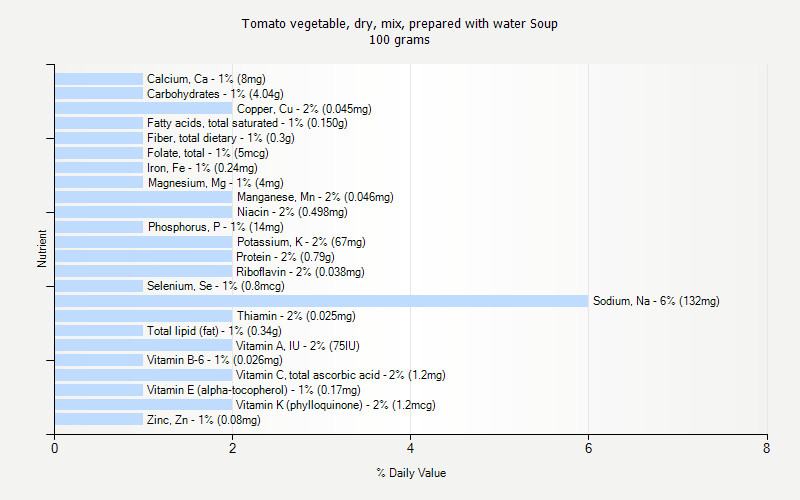 Alcohol, ethyl 0.0 gAsh 1.45 gCaffeine 0 mgCalcium, Ca 20 mgCarbohydrate, by difference 9.90 gCarotene, alpha 0 mcgCarotene, beta 108 mcgCholesterol 0 mgCholine, total 11.5 mgCopper, Cu 0.110 mgCryptoxanthin, beta 0 mcgEnergy 230 kjEnergy 54 kcalFatty acids, total monounsaturated 0.294 gFatty acids, total polyunsaturated 0.074 gFatty acids, total saturated 0.368 gFatty acids, total trans 0.000 gFiber, total dietary 0.7 gFolate, DFE 12 mcg_DFEFolate, food 10 mcgFolate, total 12 mcgFolic acid 2 mcgIron, Fe 0.59 mgLutein + zeaxanthin 88 mcgLycopene 3893 mcgMagnesium, Mg 10 mgManganese, Mn 0.113 mgNiacin 1.220 mgPantothenic acid 0.113 mgPhosphorus, P 34 mgPotassium, K 164 mgProtein 1.94 gRetinol 0 mcgRiboflavin 0.093 mgSelenium, Se 2.0 mcgSodium, Na 323 mgSugars, total 2.43 gTheobromine 0 mgThiamin 0.061 mgTocopherol, beta 0.00 mgTotal lipid (fat) 0.83 gVitamin A, IU 184 IUVitamin A, RAE 10 mcg_RAEVitamin B-12 0.05 mcgVitamin B-12, added 0.00 mcgVitamin B-6 0.064 mgVitamin C, total ascorbic acid 2.9 mgVitamin E (alpha-tocopherol) 0.42 mgVitamin E, added 0.00 mgVitamin K (phylloquinone) 2.9 mcgWater 230.89 gZinc, Zn 0.20 mg10:0 0.002 g12:0 0.005 g13:0 0.000 g14:0 0.022 g14:1 0.000 g15:0 0.002 g15:1 0.000 g16:0 0.243 g16:1 undifferentiated 0.034 g17:0 0.000 g17:1 0.000 g18:0 0.071 g18:1 undifferentiated 0.247 g18:2 undifferentiated 0.069 g18:3 undifferentiated 0.005 g18:4 0.000 g20:0 0.000 g20:1 0.007 g20:2 n-6 c,c 0.000 g20:3 undifferentiated 0.000 g20:4 undifferentiated 0.000 g20:5 n-3 0.000 g22:0 0.000 g22:1 undifferentiated 0.000 g22:5 n-3 0.000 g22:6 n-3 0.000 g24:0 0.000 g24:1 c 0.000 g4:0 0.007 g6:0 0.002 g8:0 0.000 g