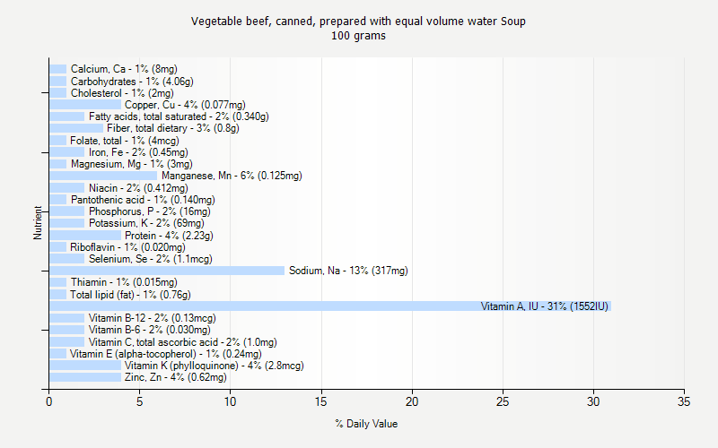 Alcohol, ethyl 0.0 gAsh 2.88 gCaffeine 0 mgCalcium, Ca 20 mgCarbohydrate, by difference 9.91 gCarotene, alpha 598 mcgCarotene, beta 1974 mcgCholesterol 5 mgCholine, total 12.2 mgCopper, Cu 0.188 mgCryptoxanthin, beta 0 mcgEnergy 76 kcalEnergy 322 kjFatty acids, total monounsaturated 0.781 gFatty acids, total polyunsaturated 0.110 gFatty acids, total saturated 0.830 gFiber, total dietary 2.0 gFolate, DFE 10 mcg_DFEFolate, food 10 mcgFolate, total 10 mcgFolic acid 0 mcgIron, Fe 1.10 mgLutein + zeaxanthin 112 mcgLycopene 444 mcgMagnesium, Mg 7 mgManganese, Mn 0.305 mgNiacin 1.005 mgPantothenic acid 0.342 mgPhosphorus, P 39 mgPotassium, K 168 mgProtein 5.44 gRetinol 0 mcgRiboflavin 0.049 mgSelenium, Se 2.7 mcgSodium, Na 773 mgSugars, total 1.10 gTheobromine 0 mgThiamin 0.037 mgTotal lipid (fat) 1.85 gVitamin A, IU 3787 IUVitamin A, RAE 190 mcg_RAEVitamin B-12 0.32 mcgVitamin B-12, added 0.00 mcgVitamin B-6 0.073 mgVitamin C, total ascorbic acid 2.4 mgVitamin E (alpha-tocopherol) 0.59 mgVitamin E, added 0.00 mgVitamin K (phylloquinone) 6.8 mcgWater 223.99 gZinc, Zn 1.51 mg10:0 0.000 g12:0 0.000 g14:0 0.037 g16:0 0.451 g16:1 undifferentiated 0.073 g18:0 0.281 g18:1 undifferentiated 0.683 g18:2 undifferentiated 0.098 g18:3 undifferentiated 0.012 g18:4 0.000 g20:1 0.000 g20:4 undifferentiated 0.000 g20:5 n-3 0.000 g22:1 undifferentiated 0.000 g22:5 n-3 0.000 g22:6 n-3 0.000 g4:0 0.000 g6:0 0.000 g8:0 0.000 g