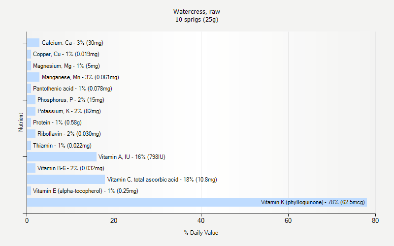 Alanine 0.047 gAlcohol, ethyl 0.0 gArginine 0.051 gAsh 0.41 gAspartic acid 0.064 gCaffeine 0 mgCalcium, Ca 41 mgCarbohydrate, by difference 0.44 gCarotene, alpha 0 mcgCarotene, beta 651 mcgCholesterol 0 mgCholine, total 3.1 mgCopper, Cu 0.026 mgCryptoxanthin, beta 0 mcgCystine 0.002 gEnergy 16 kjEnergy 4 kcalFatty acids, total monounsaturated 0.003 gFatty acids, total polyunsaturated 0.012 gFatty acids, total saturated 0.009 gFiber, total dietary 0.2 gFolate, DFE 3 mcg_DFEFolate, food 3 mcgFolate, total 3 mcgFolic acid 0 mcgGlutamic acid 0.065 gGlycine 0.038 gHistidine 0.014 gIron, Fe 0.07 mgIsoleucine 0.032 gLeucine 0.056 gLutein + zeaxanthin 1961 mcgLycopene 0 mcgLysine 0.046 gMagnesium, Mg 7 mgManganese, Mn 0.083 mgMethionine 0.007 gNiacin 0.068 mgPantothenic acid 0.105 mgPhenylalanine 0.039 gPhosphorus, P 20 mgPotassium, K 112 mgProline 0.033 gProtein 0.78 gRetinol 0 mcgRiboflavin 0.041 mgSelenium, Se 0.3 mcgSerine 0.020 gSodium, Na 14 mgSugars, total 0.07 gTheobromine 0 mgThiamin 0.031 mgThreonine 0.045 gTotal lipid (fat) 0.03 gTryptophan 0.010 gTyrosine 0.021 gValine 0.047 gVitamin A, IU 1085 IUVitamin A, RAE 54 mcg_RAEVitamin B-12 0.00 mcgVitamin B-12, added 0.00 mcgVitamin B-6 0.044 mgVitamin C, total ascorbic acid 14.6 mgVitamin E (alpha-tocopherol) 0.34 mgVitamin E, added 0.00 mgVitamin K (phylloquinone) 85.0 mcgWater 32.34 gZinc, Zn 0.04 mg10:0 0.000 g12:0 0.000 g14:0 0.000 g16:0 0.008 g16:1 undifferentiated 0.001 g18:0 0.001 g18:1 undifferentiated 0.002 g18:2 undifferentiated 0.004 g18:3 undifferentiated 0.008 g18:4 0.000 g20:1 0.000 g20:4 undifferentiated 0.000 g20:5 n-3 0.000 g22:1 undifferentiated 0.000 g22:5 n-3 0.000 g22:6 n-3 0.000 g4:0 0.000 g6:0 0.000 g8:0 0.000 g